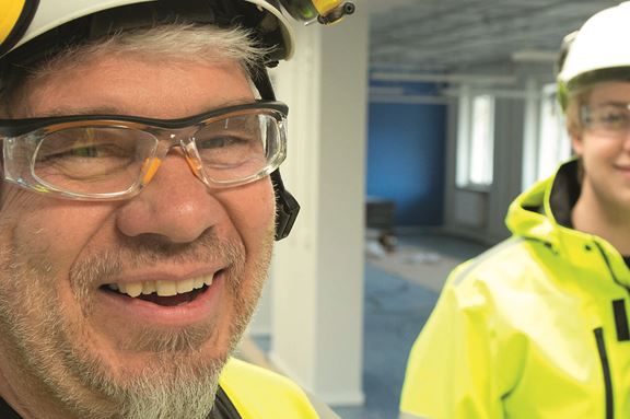 Micke Söderlund, 19, nickar mot Lasse Carlborg, 58, och konstaterar "som elektriker blir man aldrig fullärd …men Lasse är nog inte långt ifrån". Lasse å sin sida skrattar och svarar "Micke lär sig så jäkla snabbt, han har snart kört om mig."