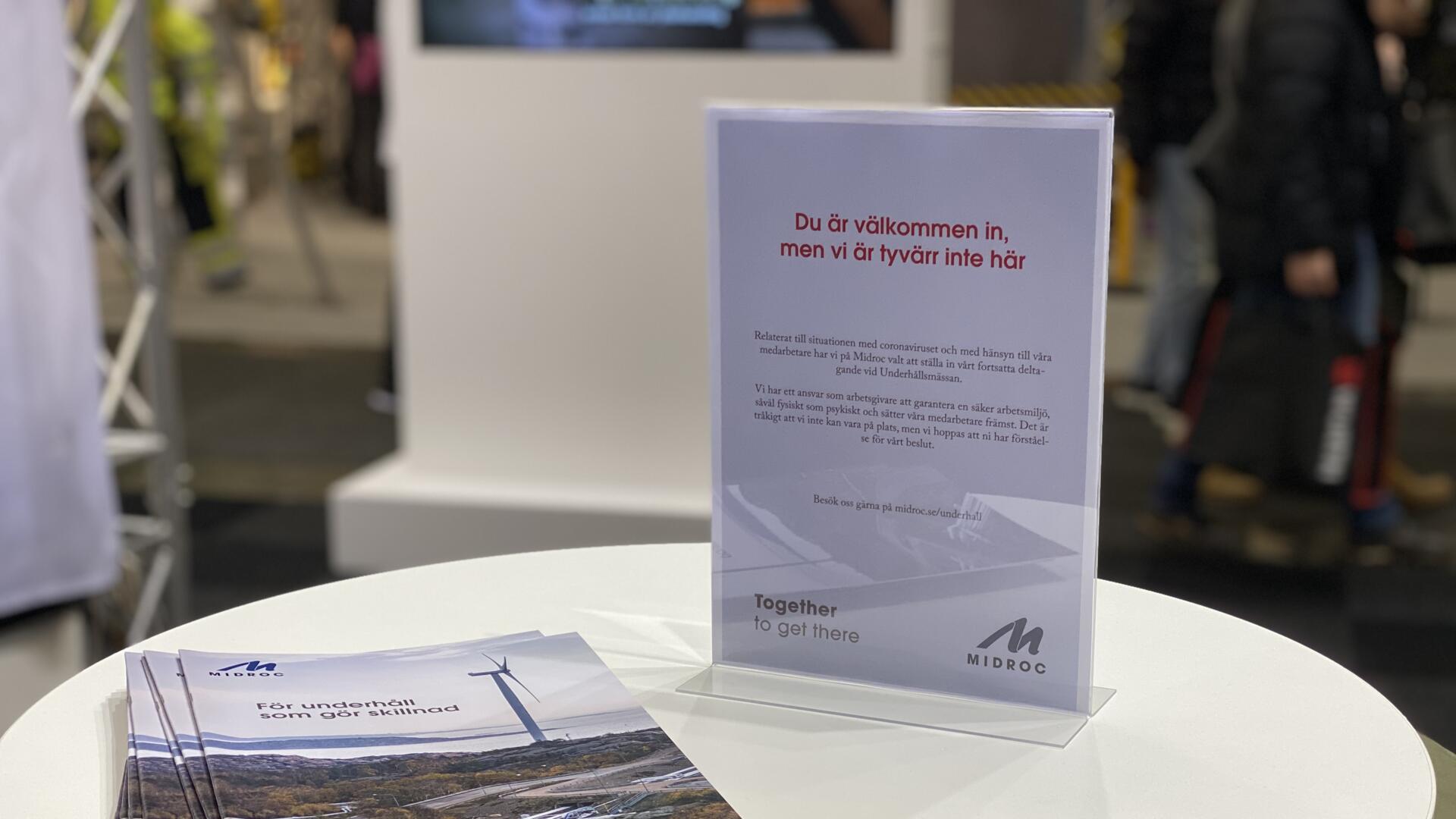 Igår öppnade Underhållsmässan i Göteborg, där Midroc ställer ut för tredje gången i rad. Igår höjde också Folkhälsomyndigheten risken för allmän smittspridning av coronaviruset i Sverige. Relaterat till situationen med coronaviruset och med hänsyn till våra medarbetare har vi på Midroc valt att ställa in vårt fortsatta deltagande vid mässan.