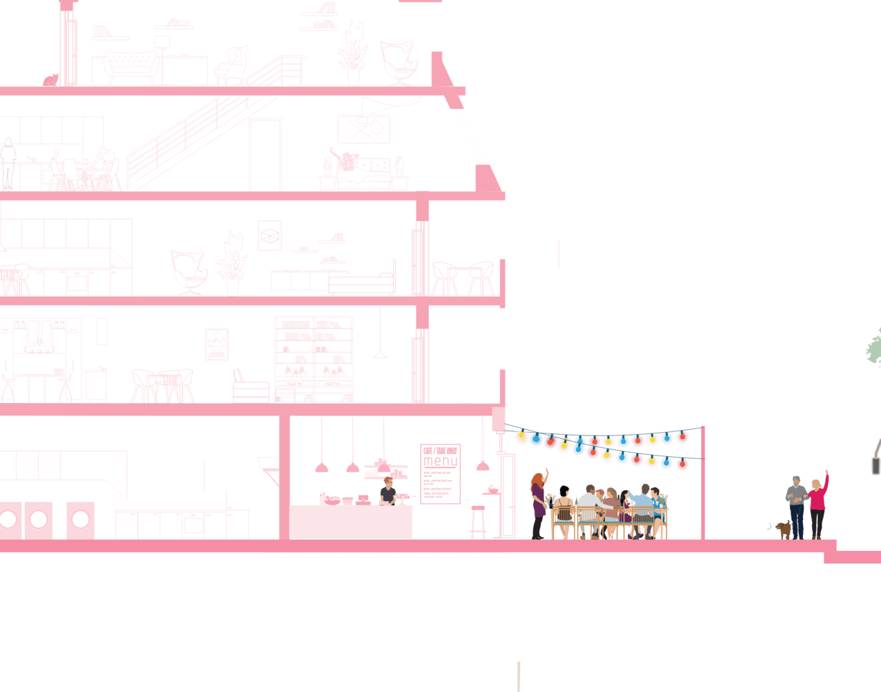 Genom att dela på mer - både funktioner, ytor och aktiviteter - skapar vi både ett mer hållbart, tillgängligt och socialt vardagsliv. Involvera både föreningsliv, grannar och kommersiella aktörer som alla kan bidra till att erbjuda fler faciliteter för alla, både till vardags och till fest.