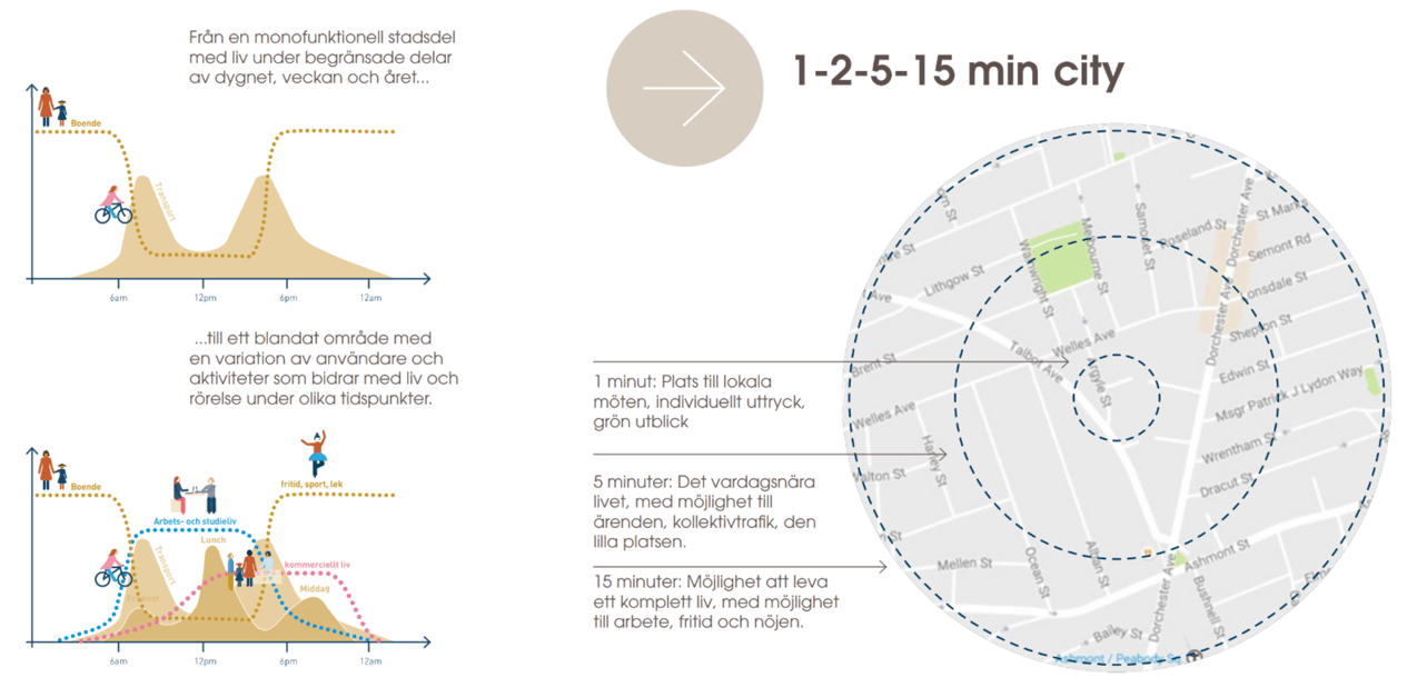 Genom att blanda och överlappa olika funktioner kan vi åstadkomma levande och aktiva miljöer under större delen av dygnet, veckan och året. Planering för en levande stadsmiljö behöver finnas med från start i ett projekt, med genomtänkt funktionsblandning, programmering och mjuka insatser för att främja den blandade staden.