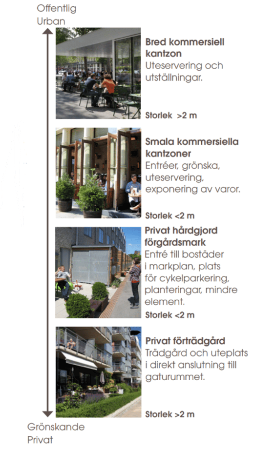 Genom att skapa möjligheter till mindre verksamheter, delfunktioner, samlingsplatser och annan service för närområdet i byggnadernas bottenvåningar ges möjlighet till en aktiv stadsmiljö. Välutformade kantzoner som skapar en mjuk övergång mellan inom- och utomhus bidrar till en inbjudande och aktiv gatumiljö.
