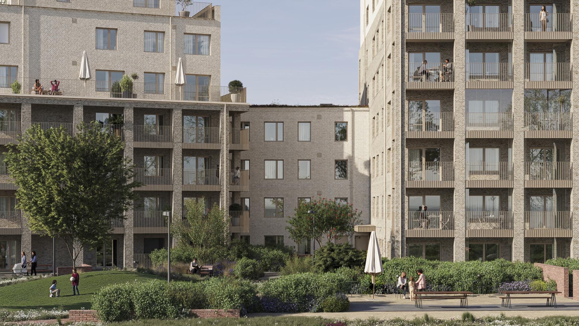 Landskapsarkitekten Alexander Henriksson på White Arkitekter har ritat hela kvarterets innergård, i nära dialog med husarkitekterna. Resultatet är Brf Etage har ett stycke grönskande natur med flera inhemska arter, som nyponrosor och hagtorn. Här väntar glödande höstfärger, mysiga hörnor med stämningsarmaturer och gott om plats för både barnens äventyr och lugna stunder i solen. I mitten breder en mjukt böljande gräsmatta ut sig, stor nog för både bollar och picknickfiltar. En liten dunge med häggmispel och körsbärskornell, barkströdda gångar och vackra stenar intill grillplatsen skapar karaktär och upptäckarlust. Häckar ramar in marklägenheternas privata uteplatser. Stenläggning skapar accenter och fina gångstråk. Förbipasserade på gatan får via trappan en glimt av vad gården har att bjuda på.