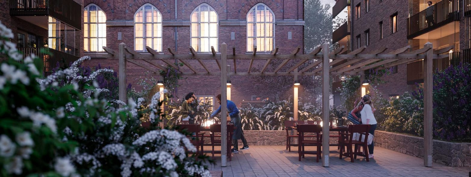 Projektet rymmer allt från yteffektiva ettor till generösa femrummare med dubbla badrum och privata takterrasser. Flera bostäder får dessutom inglasade eller indragna balkonger, uteplatser eller små trädgårdar – kvaliteter som tillsammans ger området en småskalig men stadsmässig karaktär.