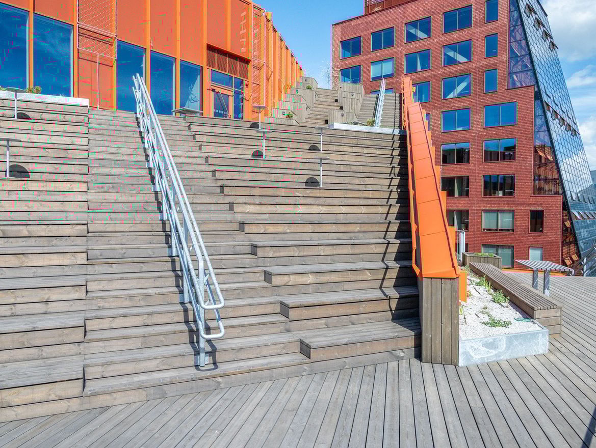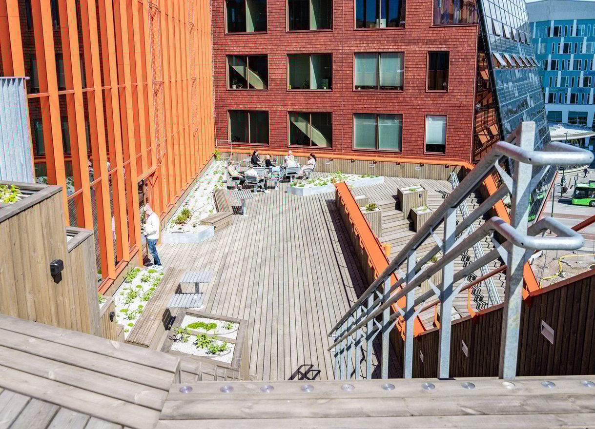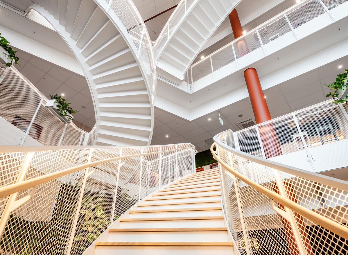 Upptäck det kreativa vardagsrummet i Embassy of Sharing, där arkitekturen bjuder in till rörelse, möten och nya perspektiv. Här finns den slingrande trätrappan längs fasaden, grönskande terrasser i söderläge, ett ljust atrium som binder samman våningsplanen och en atmosfär som inspirerar varje dag.