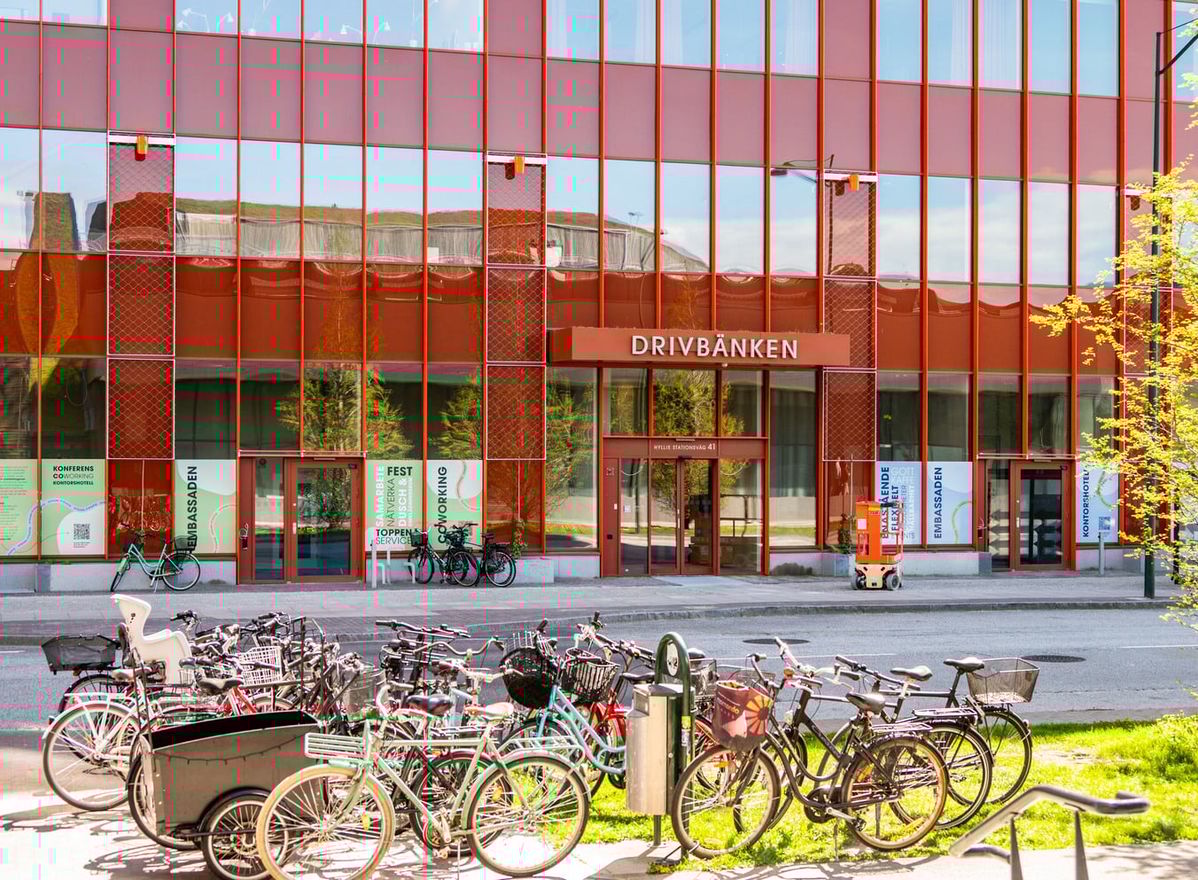 Bilder säger mycket, men inte allt. Vill du känna kreativiteten, se utsikten från takterrassen och få en känsla för vardagen i Drivbänken? Boka en visning så visar vi dig runt i Hyllies mest hållbara kontorshus. Vi berättar gärna mer om lediga lokaler, gemensamma ytor och hur ni kan bli en del av Embassy of Sharing.